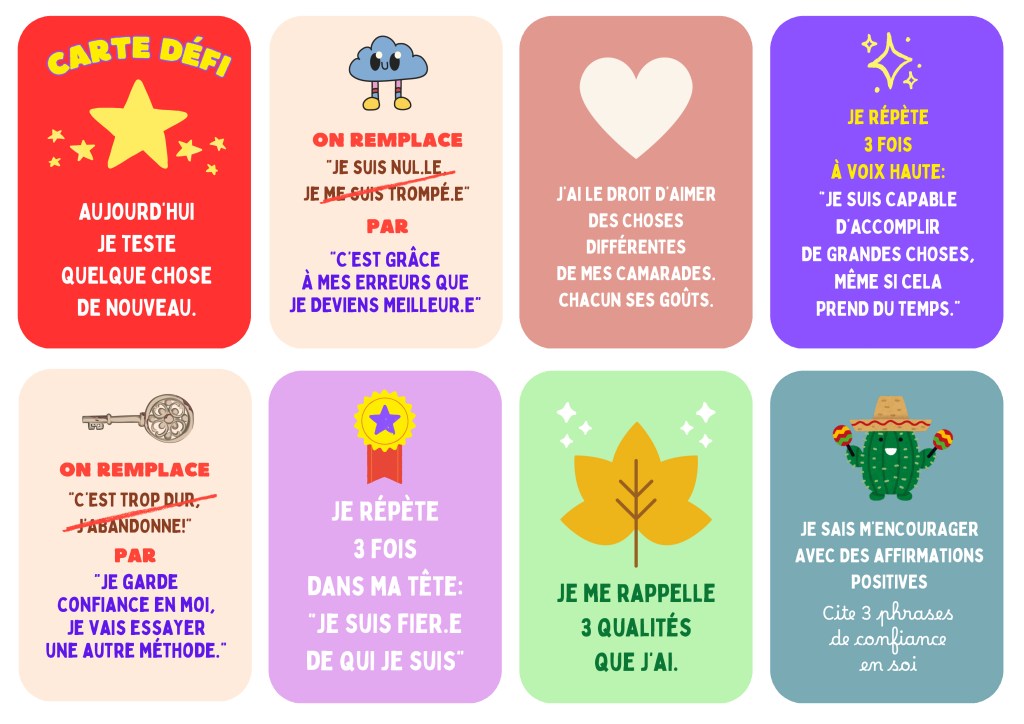 Je mets à disposition (oui c’est gratuit!) quelques petites cartes outils spéciales Confiance en soi! Vous pouvez télécharger les 2 planches (Format A4), les imprimer, les plastifier et une fois les petites cartes découpées, vous voilà prêt.e.s à faire piocher l’enfant avec lequel vous souhaitez enrichir cette ressource intérieure.